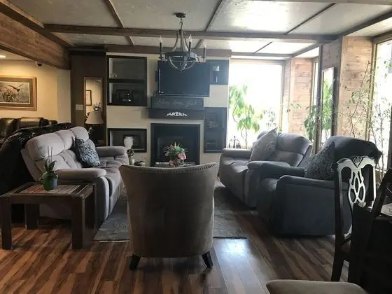 Alaska Angler's Inn misafirlerine restoranda yemek servisi yapılıyor. Oteldeki bar/oturma salonu misafirlere içecek servisi yapıyor.