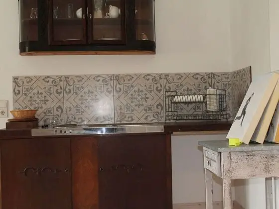 Bu ayrı ayrı döşenmiş dairede mutfak, buzdolabı ve set üstü ocak var.