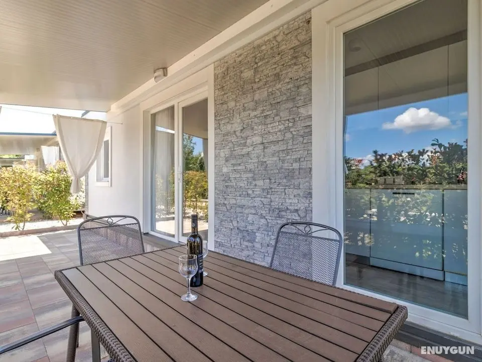 Bu ayrı ayrı döşenmiş tatil evinde özel havuz var. Misafirler için buzdolabı, mikrodalga fırın ve bulaşık makinesi olan mutfak.