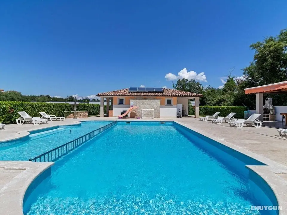 Bu ayrı ayrı döşenmiş tatil evinde özel havuz var. Misafirler için buzdolabı, mikrodalga fırın ve bulaşık makinesi olan mutfak.