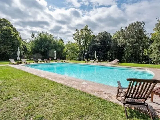 Bu ayrı ayrı döşenmiş tatil evinde misafirler için şömine ve özel havuz mevcut.