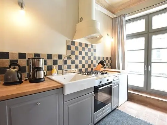 Bu ayrı ayrı döşenmiş tatil evinde mutfak, buzdolabı ve fırın var.