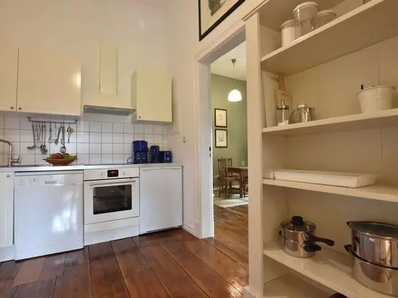 Bu ayrı ayrı döşenmiş dairede şömine var. Misafirler için buzdolabı, set üstü ocak ve bulaşık makinesi olan mutfak.