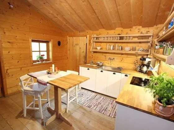 Bu kır evinde mutfak, buzdolabı ve set üstü ocak var.