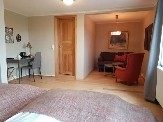 Sanner Hotell misafirlerine restoranda yemek servisi yapılıyor. Oteldeki bar/oturma salonu misafirlere içecek servisi yapıyor.
