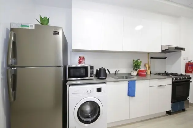Bu dairede mutfak, tam boy buzdolabı/dondurucu ve mikrodalga fırın var.