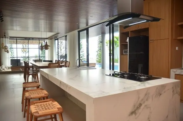 Klimalı bu villada özel havuz keyfi sizi bekliyor. Misafirler için buzdolabı, set üstü ocak ve mikrodalga fırın olan mutfak. Misafirlerin konforu için ayrı oturma alanı ve pilav pişirici sunulmaktadır.